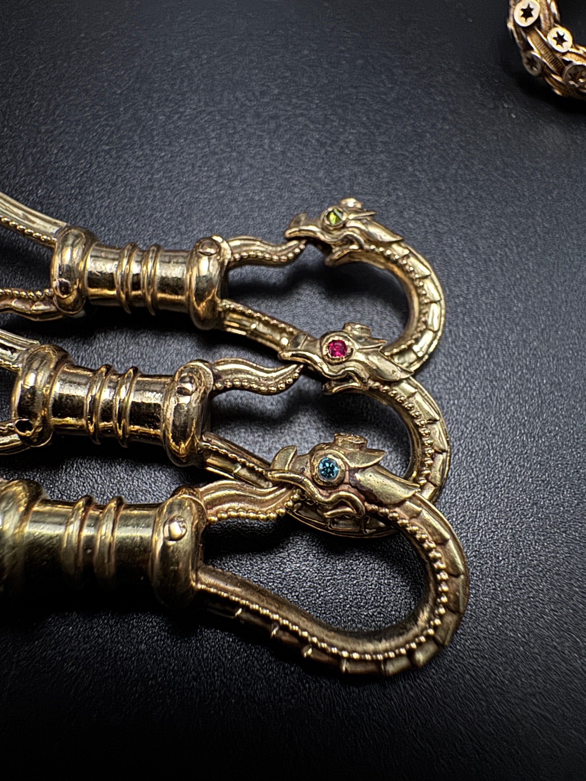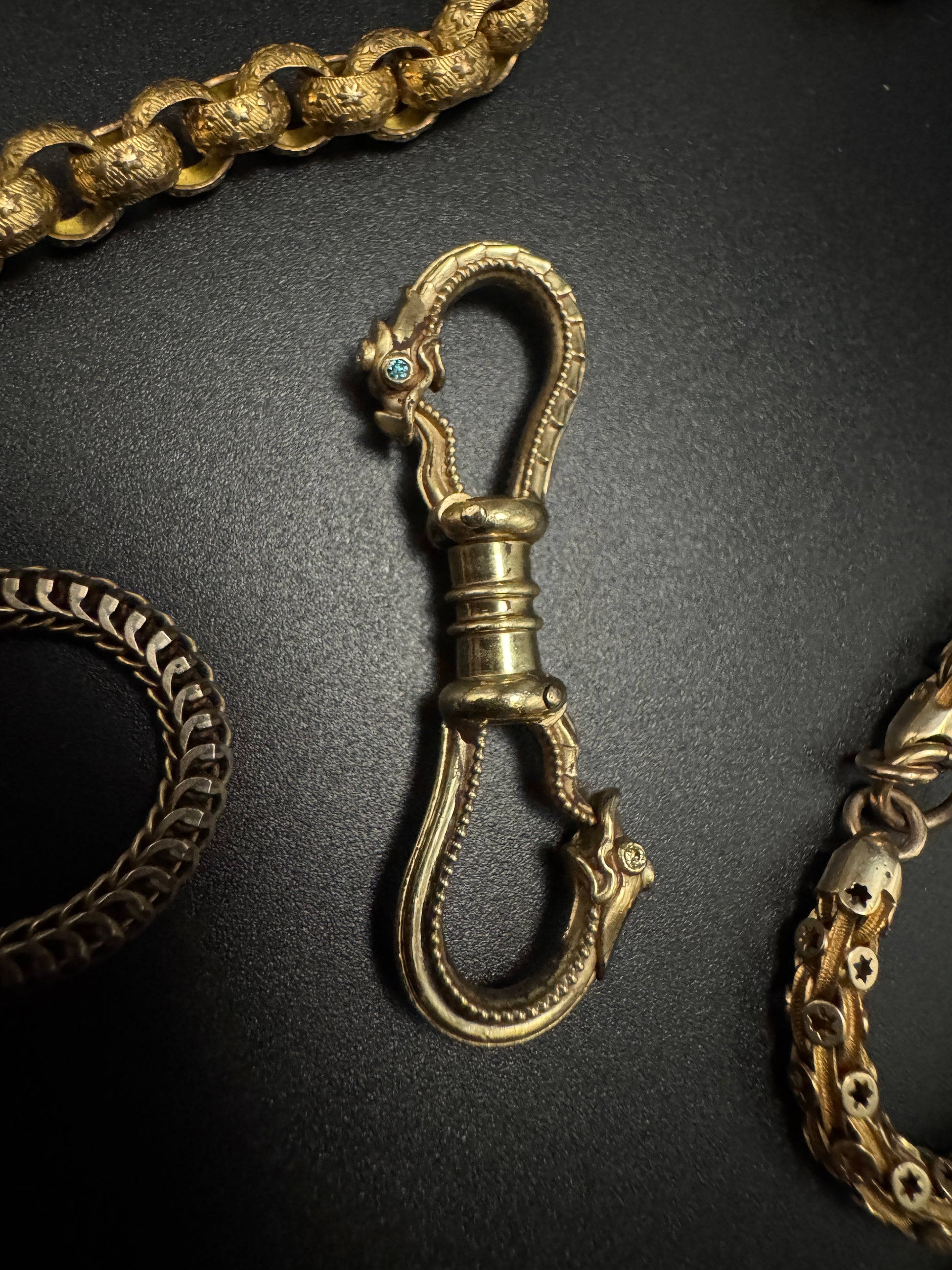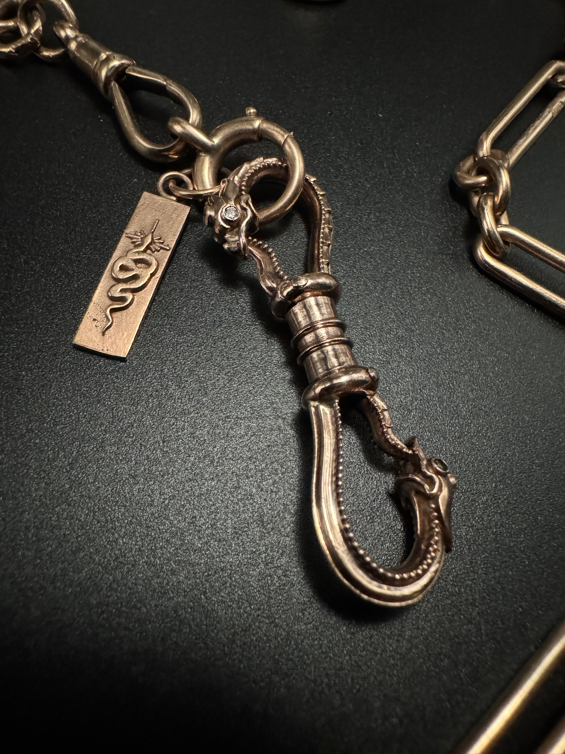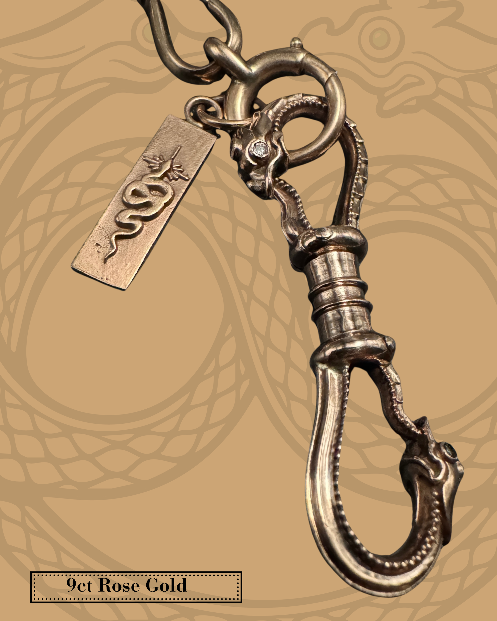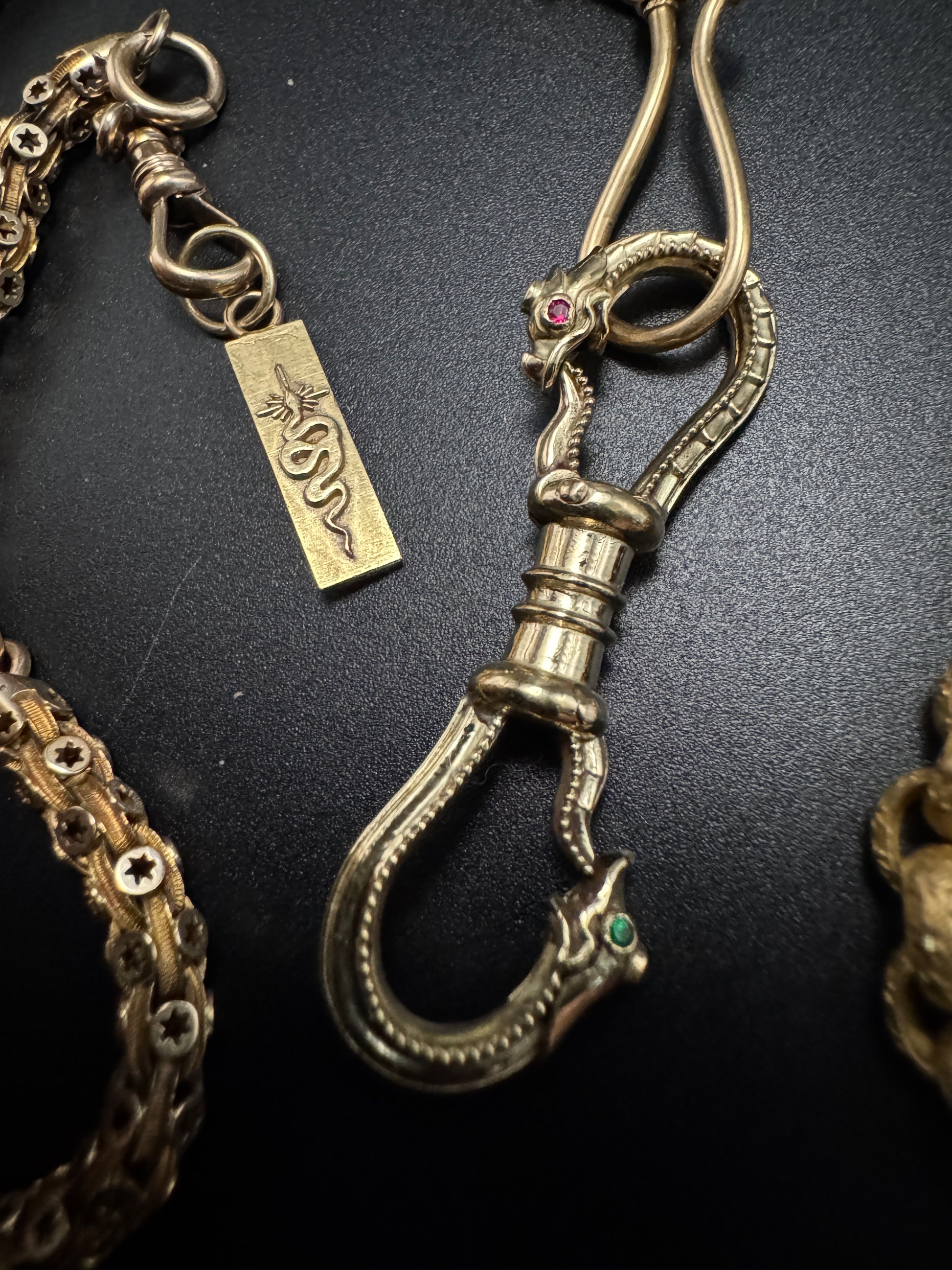 Inspired by antique snake jewellery from the Victorian and Georgian period this solid gold working dog clip is a statement piece. It features customisable eyes with precious stones and two working spring clips. From concept to creation everything is completed in our workshop by Mr Trunk himself. You will notice that both serpents are of different design, one with a barbed and scaled design and the other a sleeker serpent. This piece will work hard in anyones collection as a multi functional piece to hang charms or extend chains.
