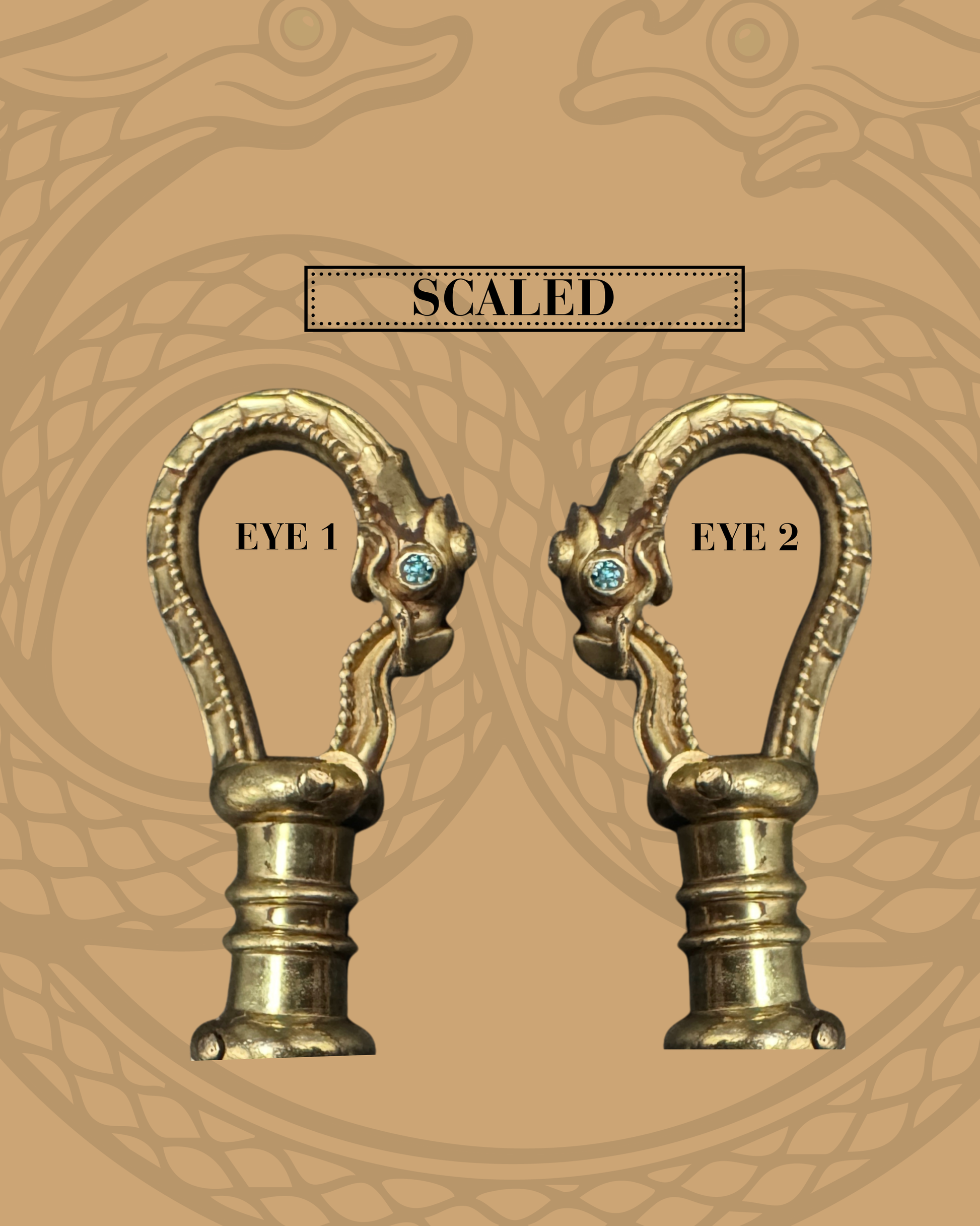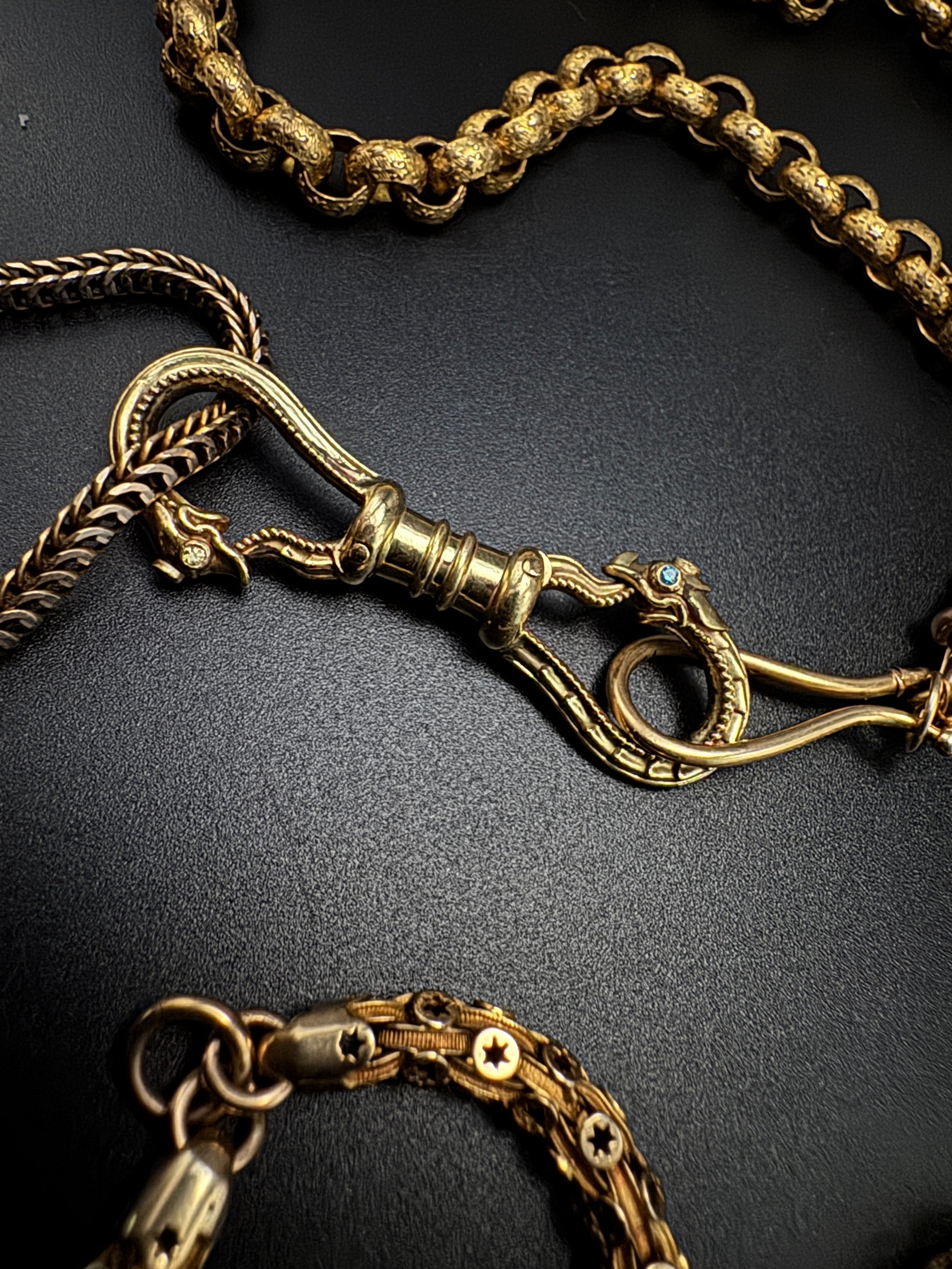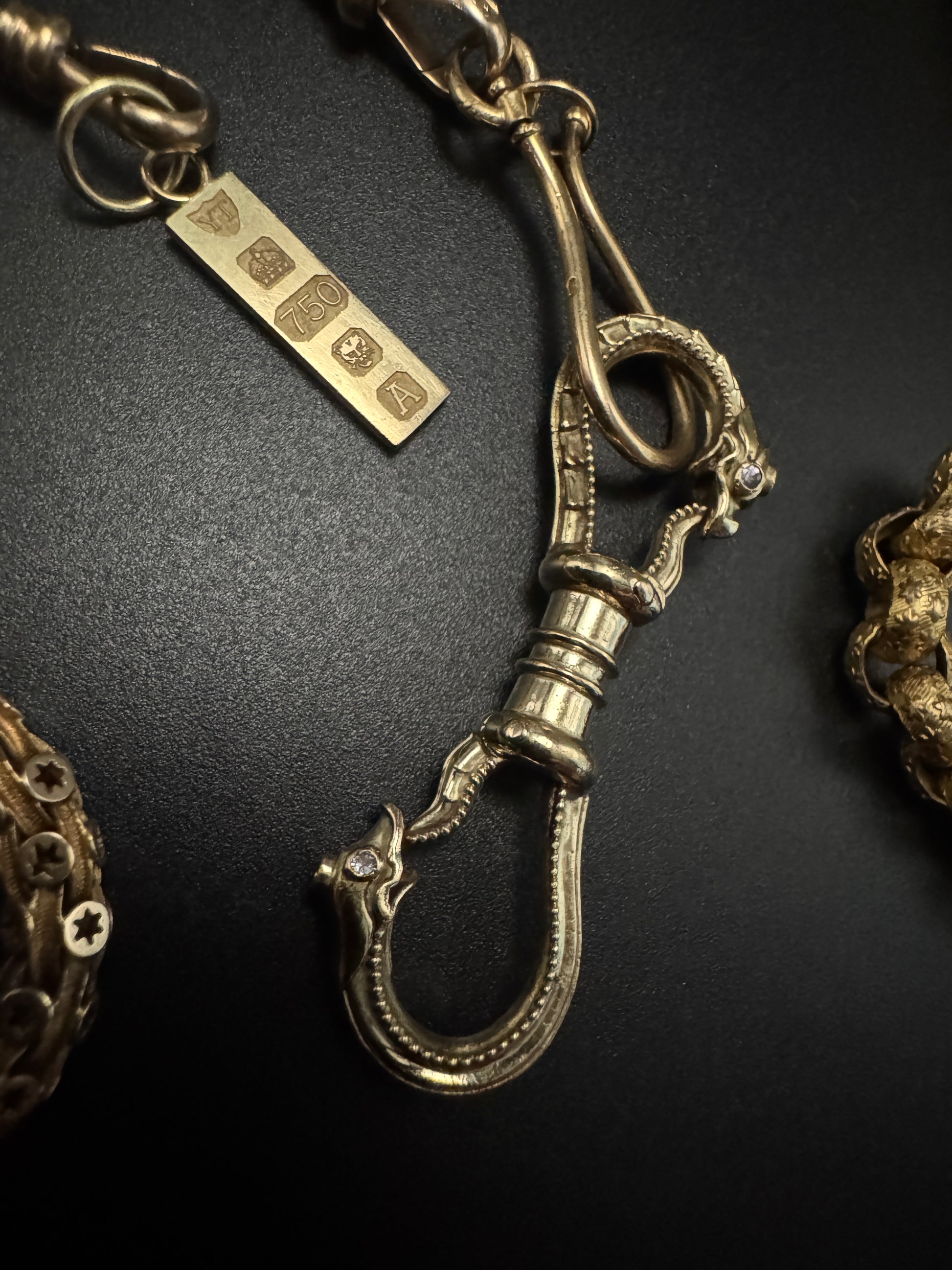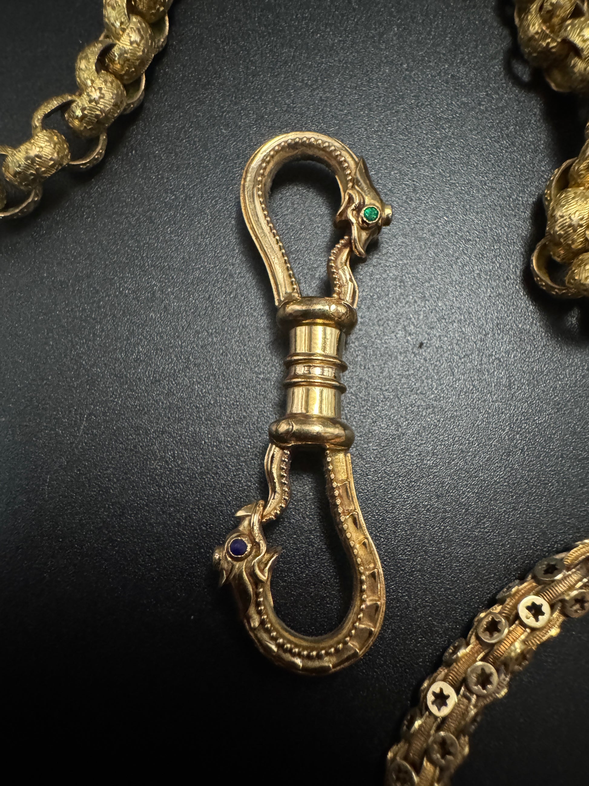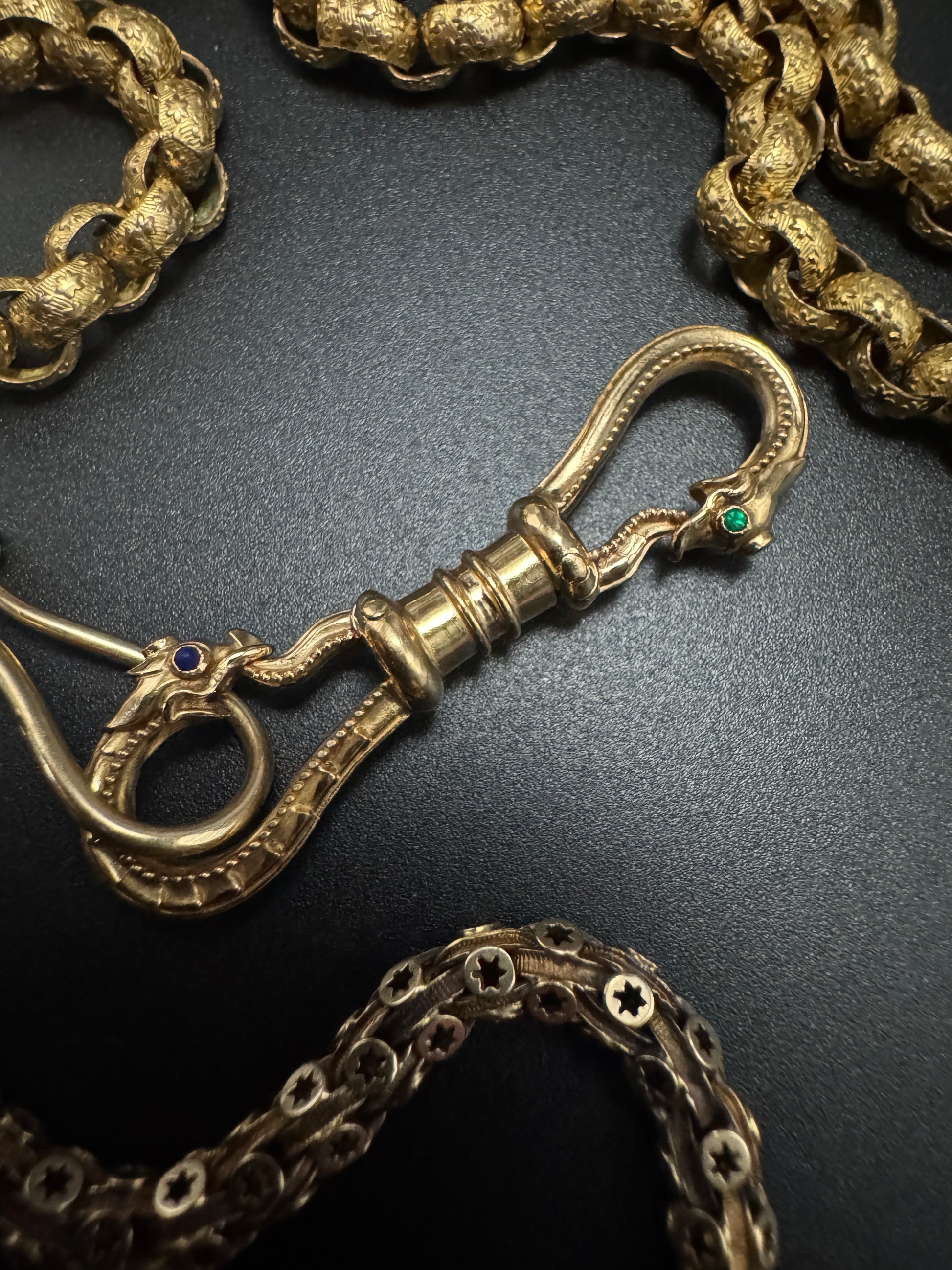 Inspired by antique snake jewellery from the Victorian and Georgian period this solid gold working dog clip is a statement piece. It features customisable eyes with precious stones and two working spring clips. From concept to creation everything is completed in our workshop by Mr Trunk himself. You will notice that both serpents are of different design, one with a barbed and scaled design and the other a sleeker serpent. This piece will work hard in anyones collection as a multi functional piece to hang charms or extend chains.